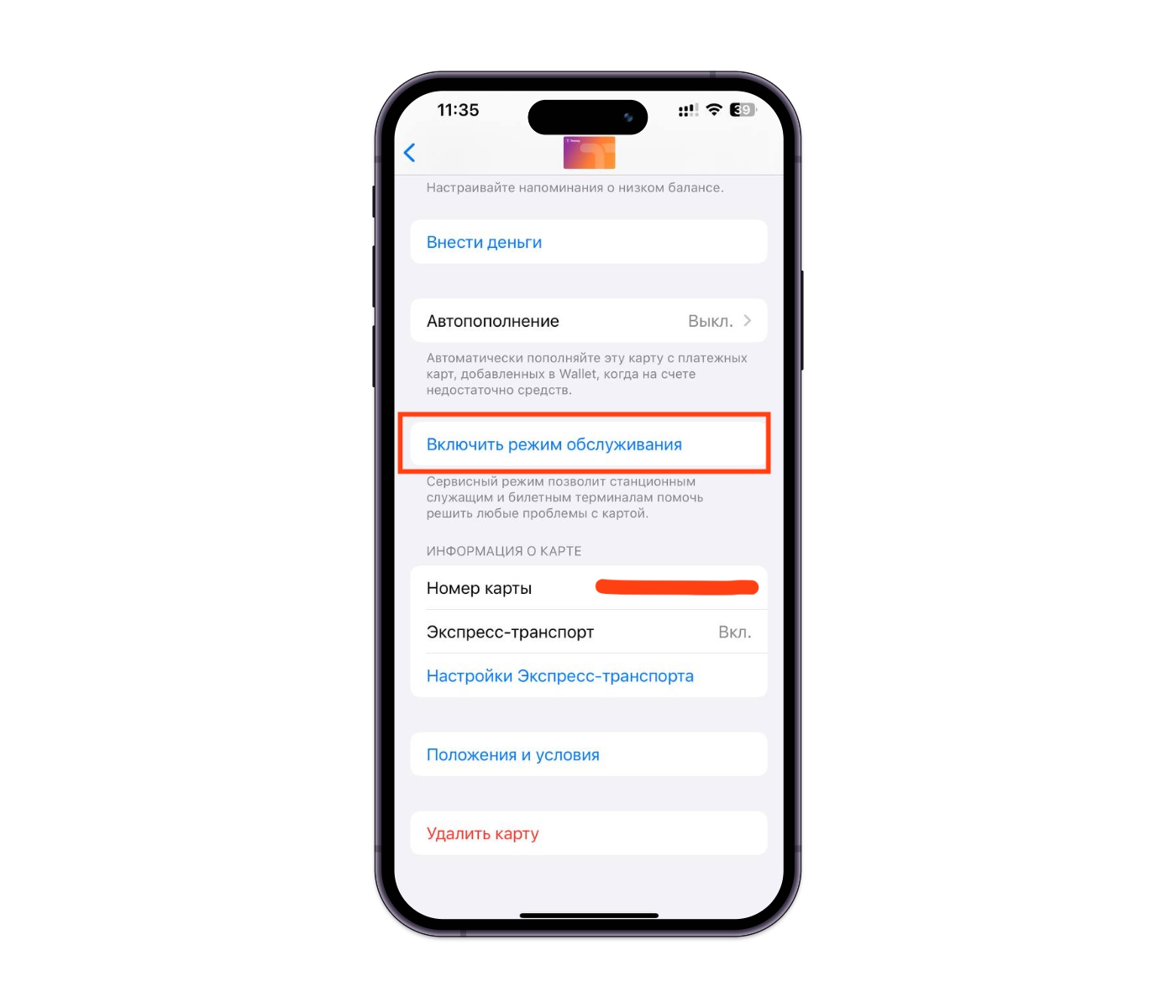 Откройте карту Tmoney в Apple Wallet → «...» → «Данные карты» → включите Режим обслуживания (Service Mode).
